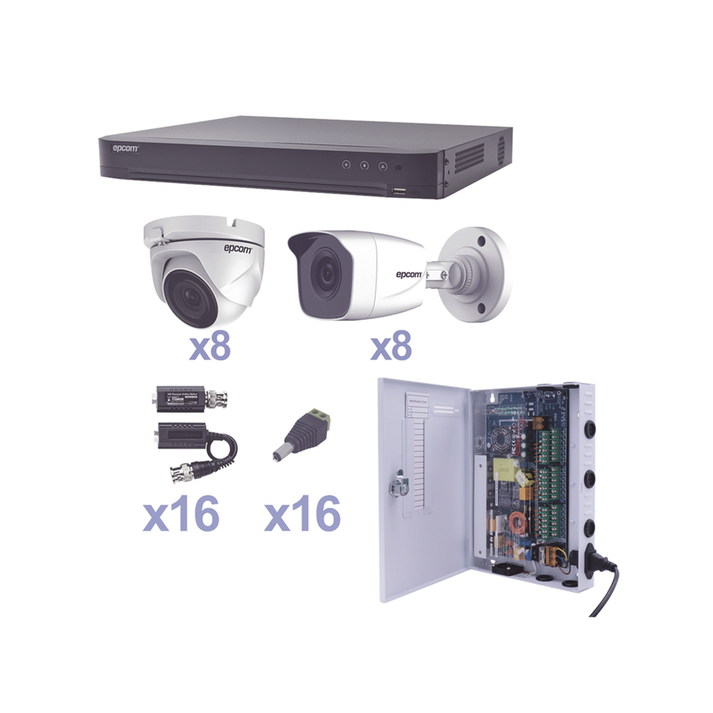 KIT TurboHD 1080p / DVR 16 Canales / 8 Cámaras Bala (exterior 2.8 mm) / 8 Cámaras Eyeball (exterior 2.8 mm) / Transceptores / Conectores / Fuente de Poder Profesional